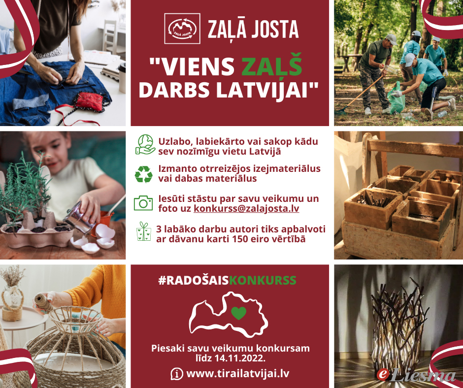 Aicinot rudens sezonu un Latvijas valsts svētku gaidīšanas laiku veltīt zaļām un praktiskām nodarbēm, «Zaļā josta» izsludina radošo konkursu «Viens zaļš darbs Latvijai», uzaicinot iedzīvotājus veidot, labot, būvēt, meistarot un radīt praktiskus priekšmetus un paveikt nozīmīgus labiekārtošanas darbus savā apkārtnē kā dāvanu valstij svētkos.