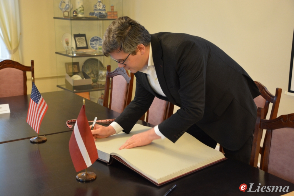 ASV VĒSTNIECĪBAS Tirdzniecības nodaļas vadītāja vietnieks Endrjū Barijs parakstās pašvaldības Viesu grāmatā. Publicitātes foto
