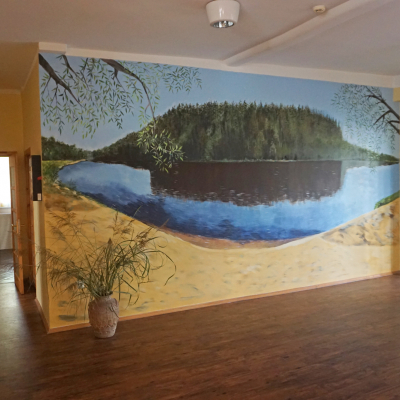 Viņnedēļ, kad Liesma pabija Strenčos, sanāca aizbraukt arī uz Kultūras centru, kur pirmā stāva vestibilā nesen tapis jauns apskates objekts – Valmieras mākslinieces Lienes Siliņas darināts sienas gleznojums.