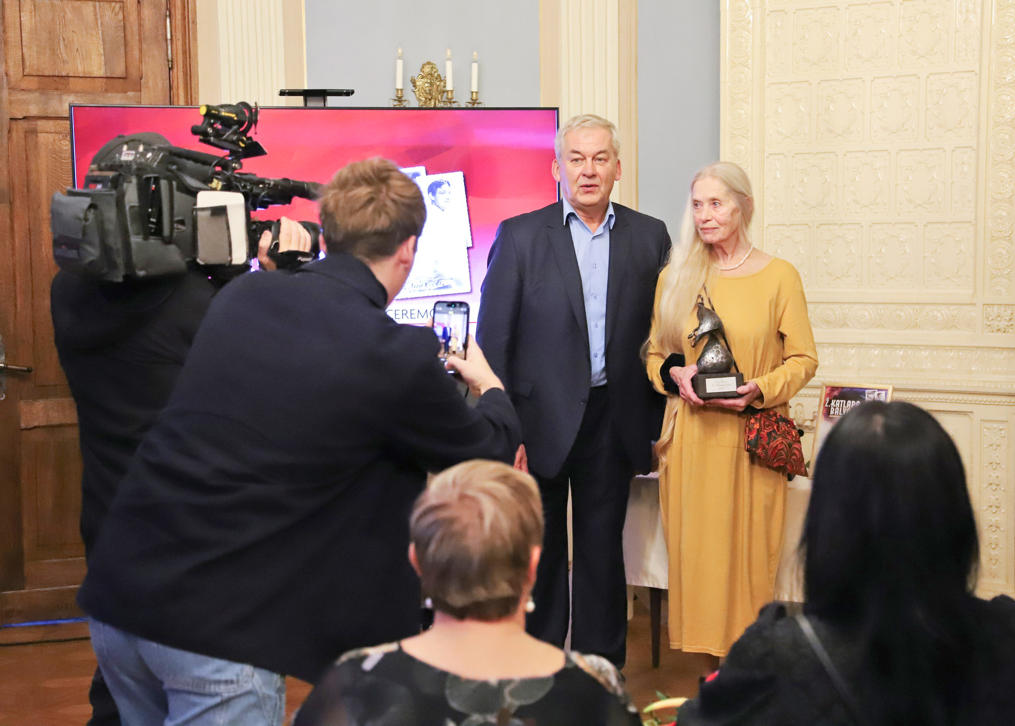 GODAM NOPELNĪTS darba novērtējums. Balvu saņemot, Dace Everss kopā ar teātra zinātnieku Jāni Siliņu Durbes pilī. Foto no Tukuma muzejs/ Facebook
