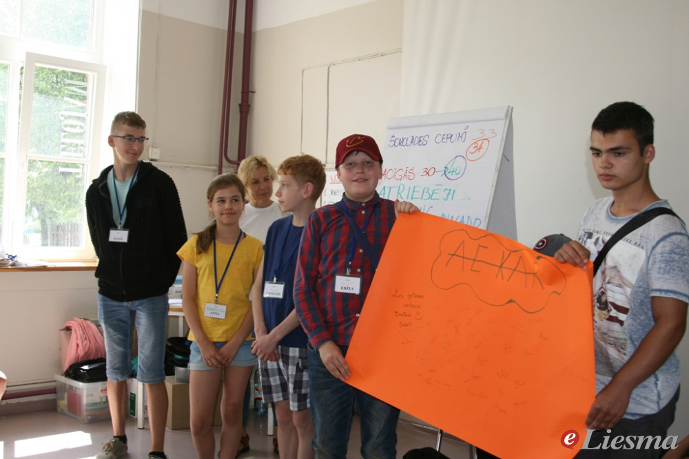 KOMANDAS DARBS. Jaunieši gandarīti prezentē savu plakātu, kurā savākuši valmieriešu smaidus/parakstus. Ārijas Romanovskas foto