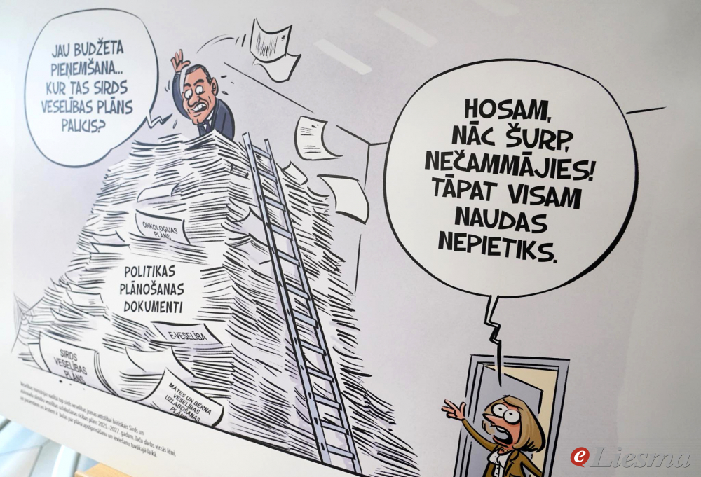 Karikatūru autors ir mākslinieks Gatis Šļūka, un izstāde oktobrī atklāta ne bez iemesla, jo tieši pašlaik notiek valsts budžeta apspriešana un tieši tagad nozares arodbiedrība gatava rosināt veselības ministra Hosama Abu Meri atstādināšanu, un izstāde kā kulaks uz acs ir arī tamdēļ, ka, gribi vai negribi, bet Latvijā atkal sācies jauns populisma un solījumu vilnis, jo nākamajā gadā Saeimas vēlēšanas.