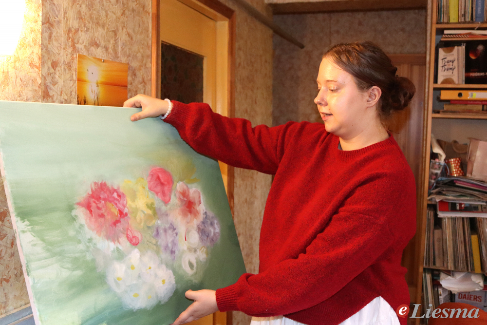 ALISE PATRĪCIJA ALBERINGA rāda ziedu gleznu – buķeti mammai. Ārijas Romanovskas foto