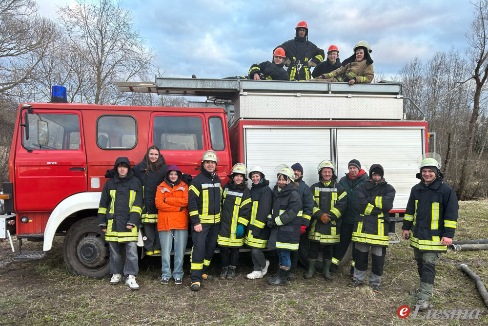 Ramatas brīvprātīgo ugunsdzēsēju komanda mācībās.