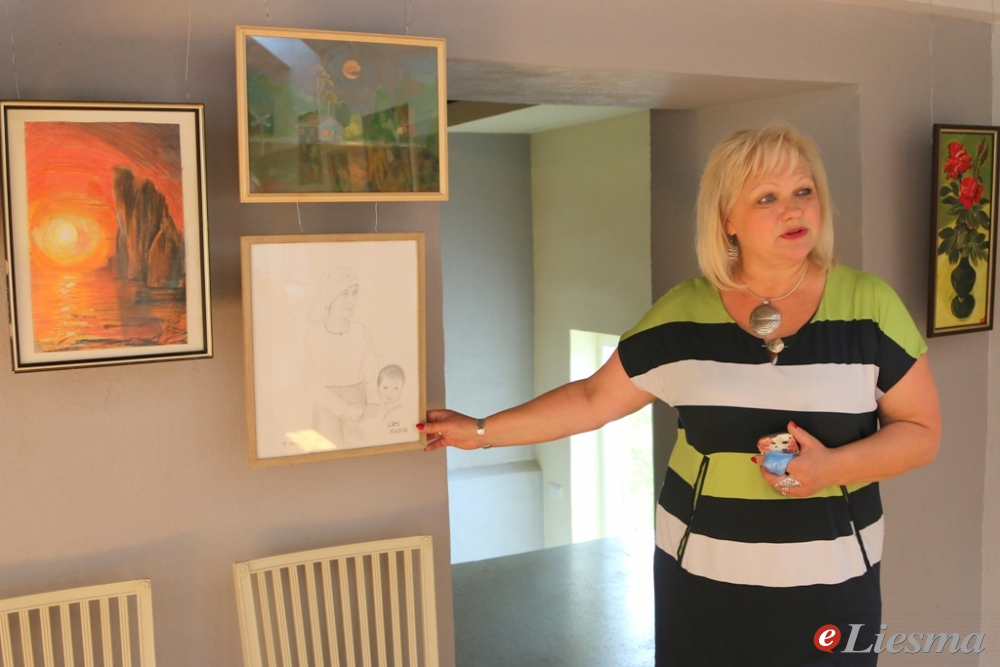 IZSTĀŽU ZĀLĒ — SAIMNIECĪBAS MĀJĀ. Ināra Blūma iepazīstina ar igauņu gleznu izstādi Jāņa Līgata foto.