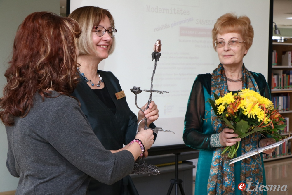 Taču šīs dienas galvenais notikums neapšaubāmi bija metālmākslinieka Andra Dukura darinātā svečtura Zelta rozes formā un Zonta kluba Atzinības raksta svinīgā pasniegšana izcilai sievietei, kura devusi nozīmīgu ieguldījumu Valmieras un tās apkaimes novadu dzīves attīstībā, un šogad, novērtējot viņas nopelnus Vidzemes informatīvās telpas veidošanā, par tādu tika atzīta mūsu laikraksta Liesma ilggadējā galvenā redaktore (no 1991. gada) Antra Lāce! Kā bibliotēkas datu bāzē bija izpētījusi Anita Apine, tikai no 2000. gada vien Antrai nodrukātas 800 saturīgas intervijas, bet cik to vēl bijis pirms tam!