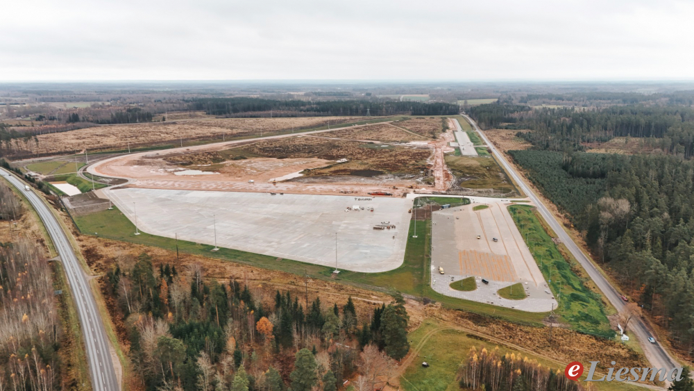 ATLIEK VIEN GAIDĪT PIRMĀS KRAVAS. Ir 2025. gada novembris, un Valmieras Industriālā parka 4,6 hektārus plašais loģistikas laukums (priekšplānā vidū) ir pilnā darba kārtībā, lai apkalpotu klientus ne tikai no Vidzemes un Latvijas, bet arī no kaimiņvalsts Igaunijas. Foto no Valmieras novada pašvaldības arhīva