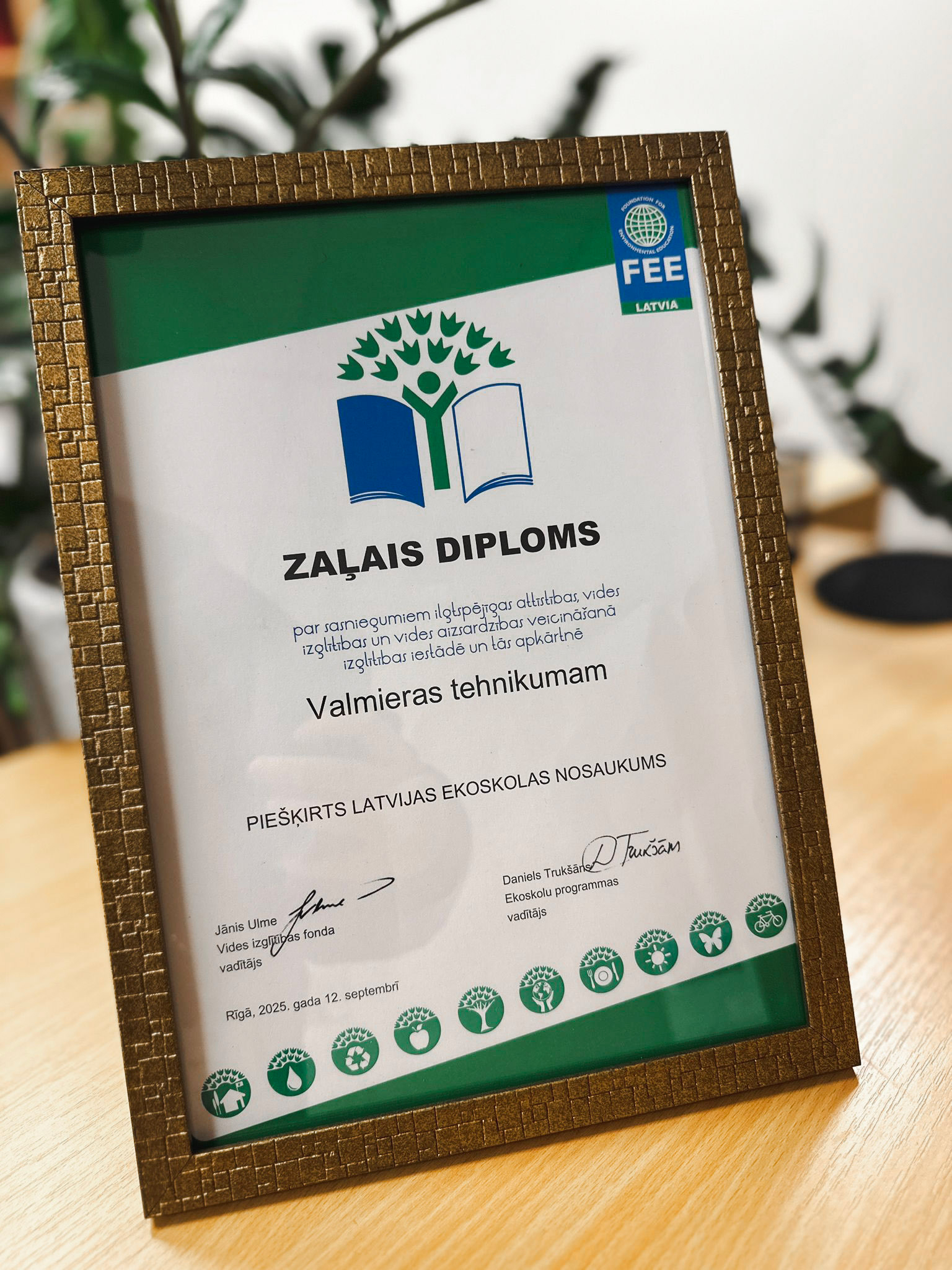 Valmieras tehnikums jau otro gadu pēc kārtas saņēma Ekoskolu Zaļo sertifikātu, kas apliecina tehnikuma iesaisti vides izglītības un ilgtspējīgas attīstības veicināšanā.