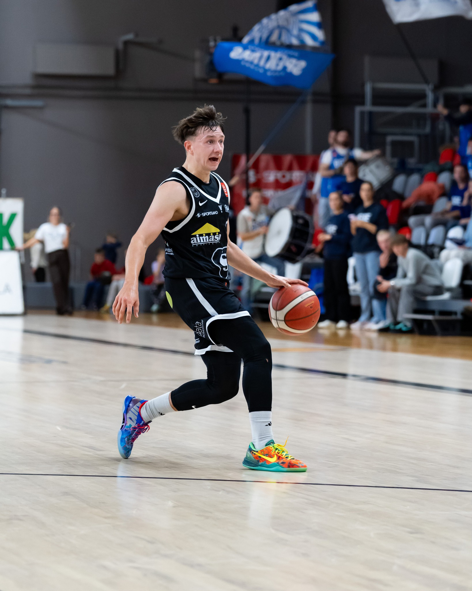 MAZAIS, ŅIPRAIS CINĪTIS! Augumā vismazākais Valmiera Glass/Vidzemes Augstskolas basketbolists, lietuviešu saspēles vadītājs Dominiks Steņonis šobrīd laukumā ir neapstrīdams komandas līderis, gatavs gāzt jebkuru pretinieku vezumu! Foto no komandas Facebook arhīva